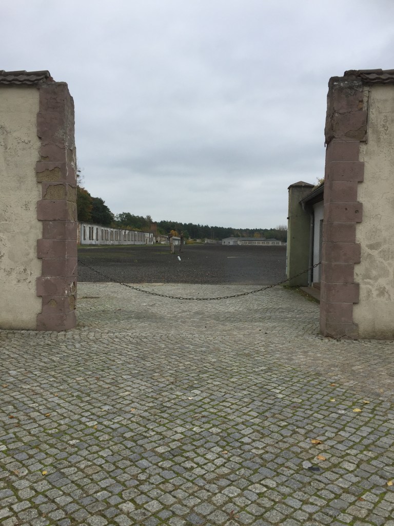 Ingången till lägret (bilden tagen i nutid, portarna är inte kvar). Till vänster är byggnaden med korridoren där pojken stod som skulle straffas. Rakt fram är delar av fabriksbyggnaden där Hella jobbade. Till höger direkt innanför murarna, är byggnaden där alla nya fångar fick klä av sig och raka av håret. På den stora tomma markplanen stod alla baracker, men de revs efter kriget och finns inte kvar även om resten av platsen nu är bevarad som museum.